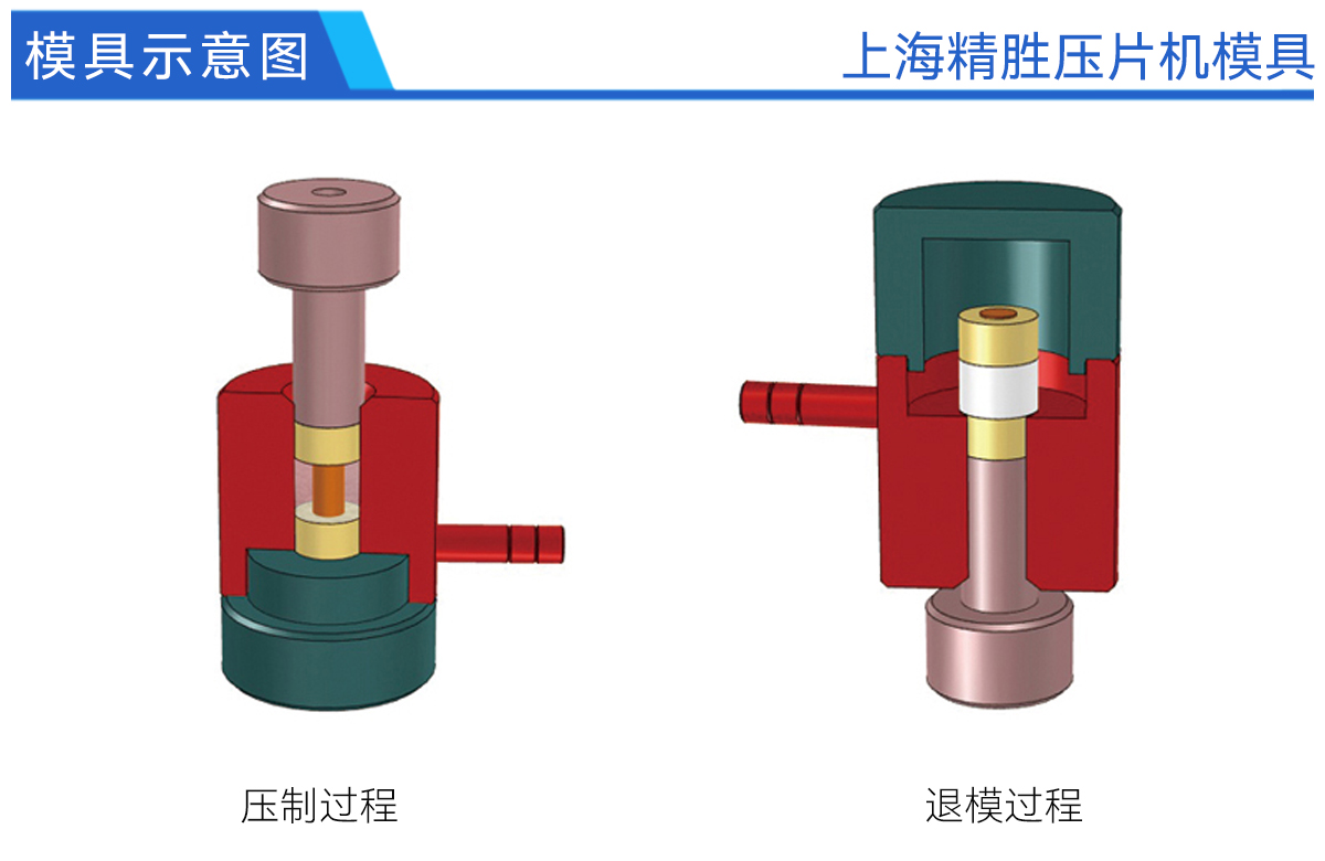 3、将模具按照模具退模过程示意图组装好,放置到压片机中用丝杠将样品从模具套中定出;
